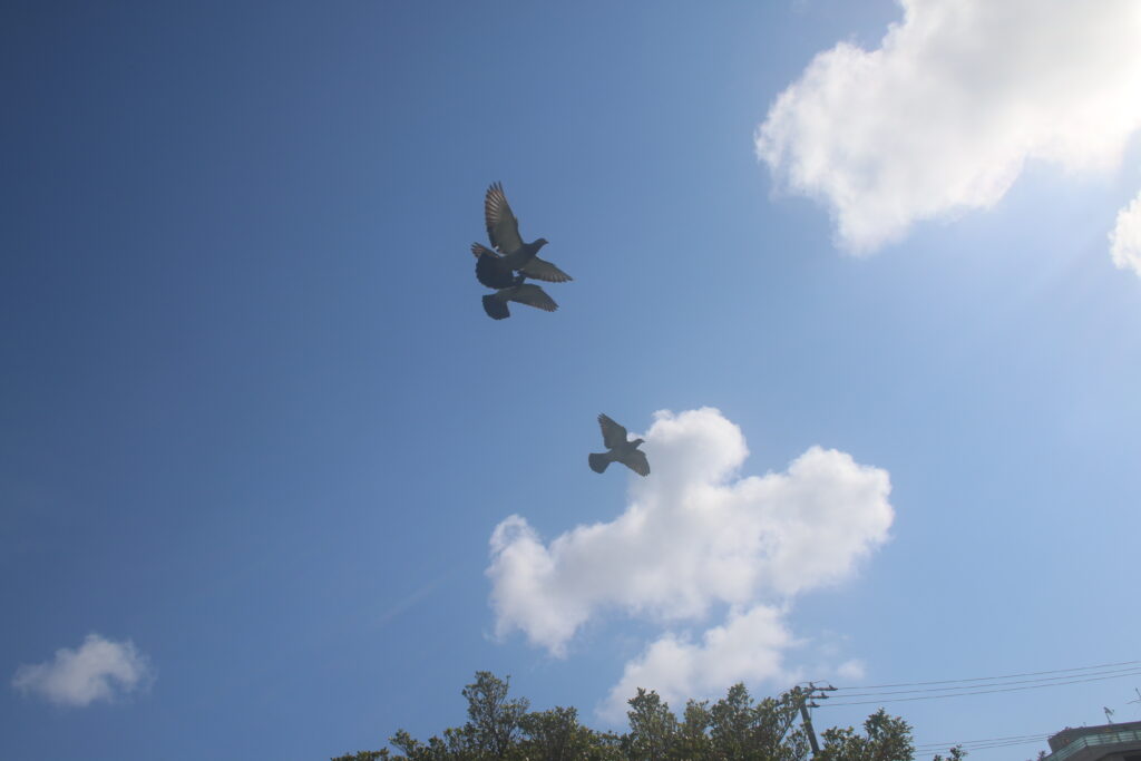 公園のハトが気持ちよさそうに青空を飛んでいました。